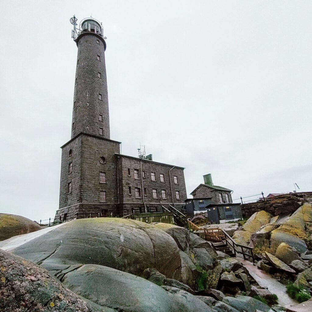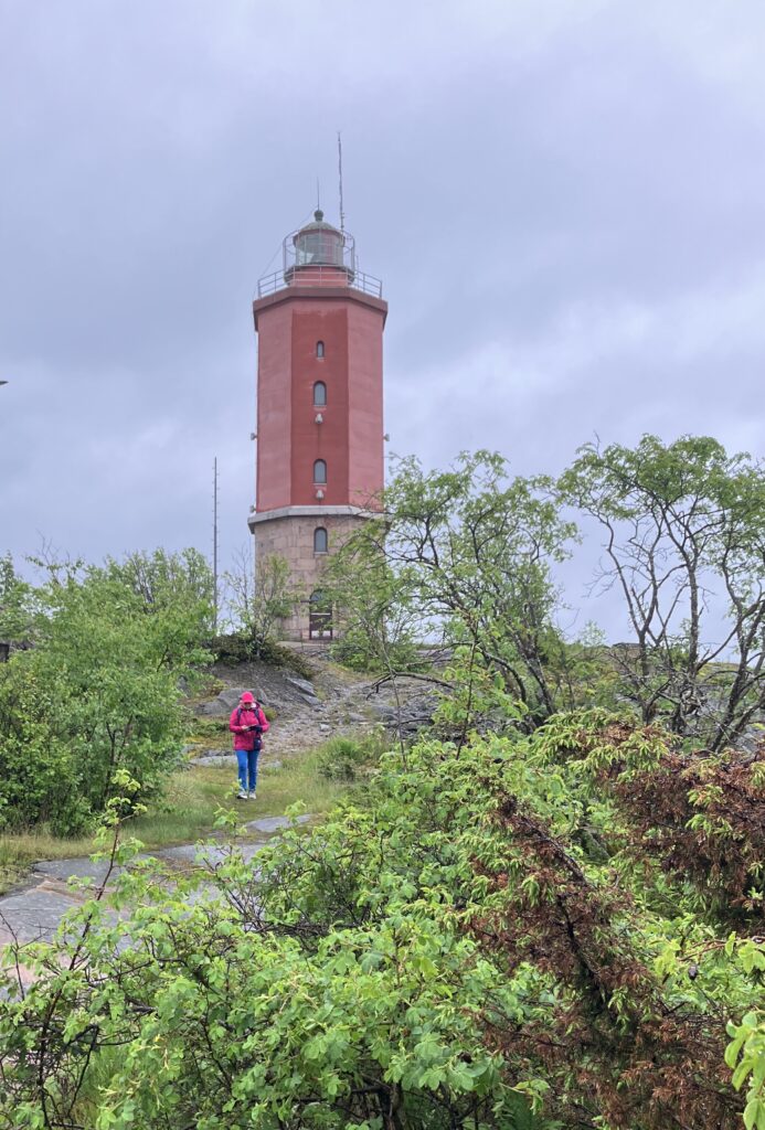 Saarivierailumme alkoi oppaan tarinalla majakasta ja kalliosaaren omistuksesta käydyistä kiivaista taisteluista heinäkuussa 1941. Omatoimisen tutustumisen aikana hyväjalkaisimmat kävivät jopa majakan huipulla – 52 m merenpinnasta. Haahkoja näkyi hautomassa ympäri saarta. Niitä kerrotaan pesivän saarella ihmisten turvissa yli 500! – Koko ajan jatkunut sade kyllä latisti käyntiämme.